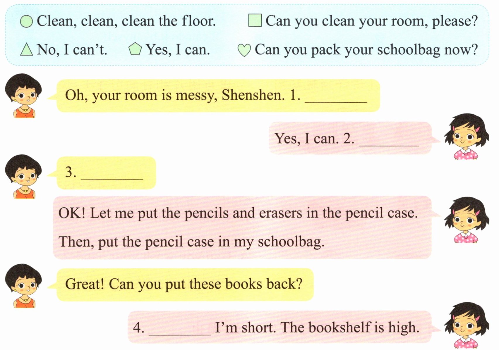 Ⅳ. Read, choose and draw(星期六,Shenshen 和家人们在家大扫除。请将他们的对话补充完整,并将相应的形状画在横线上)