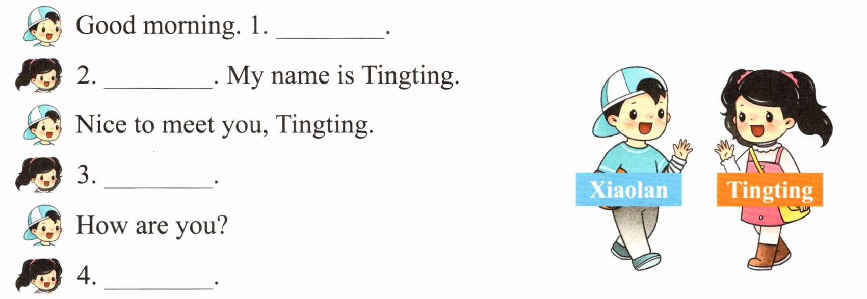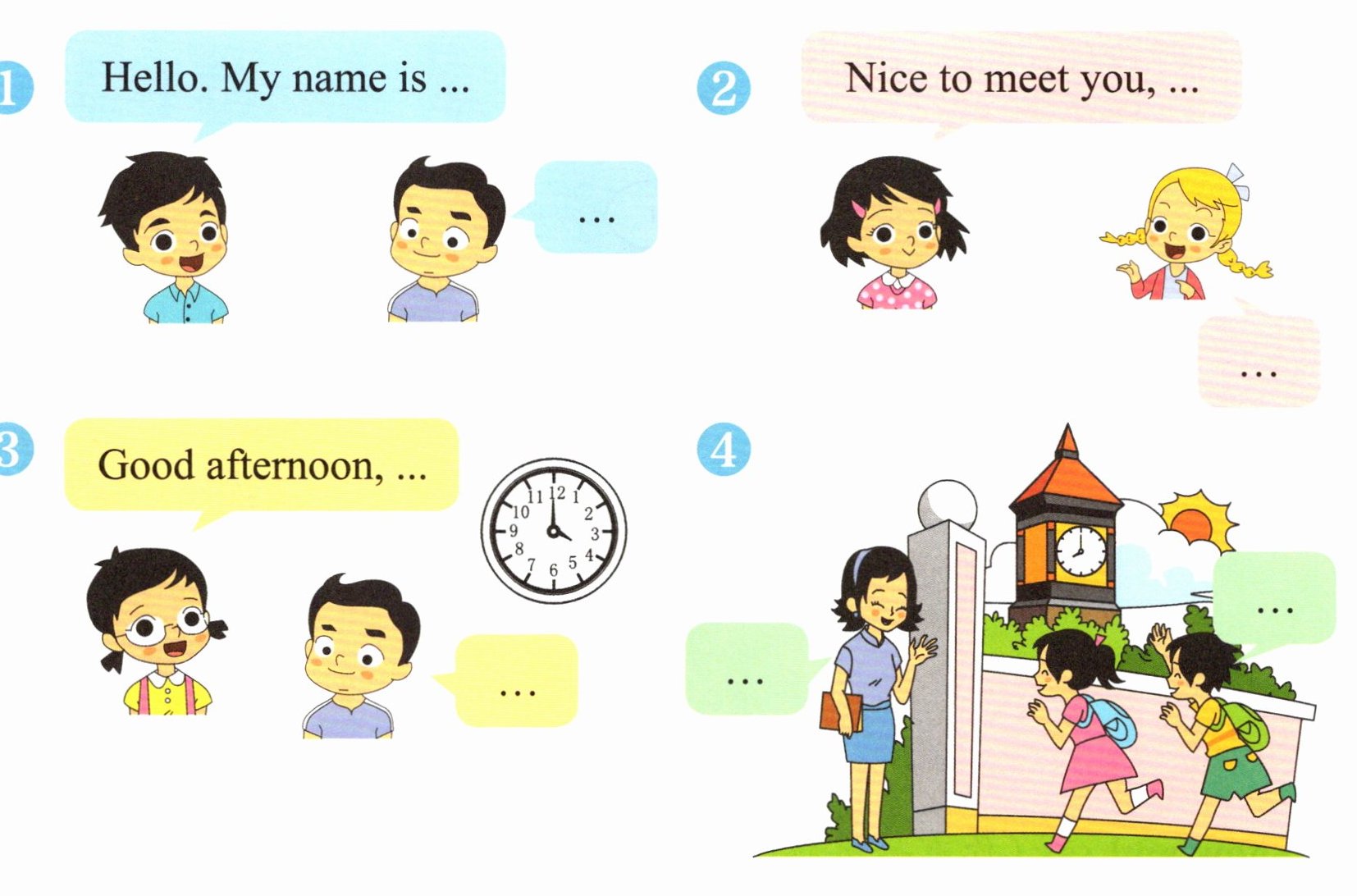 1. —Hello. My name is Xiaopu. —Hello, Xiaopu. 2. —Nice to meet you, Lily. —Nice to meet you, Shenshen. 3. —Good afternoon, Minmin. —Good afternoon, Xinxin. 4. —Good morning, Miss Li. —Good morning (此题答案仅供参考)