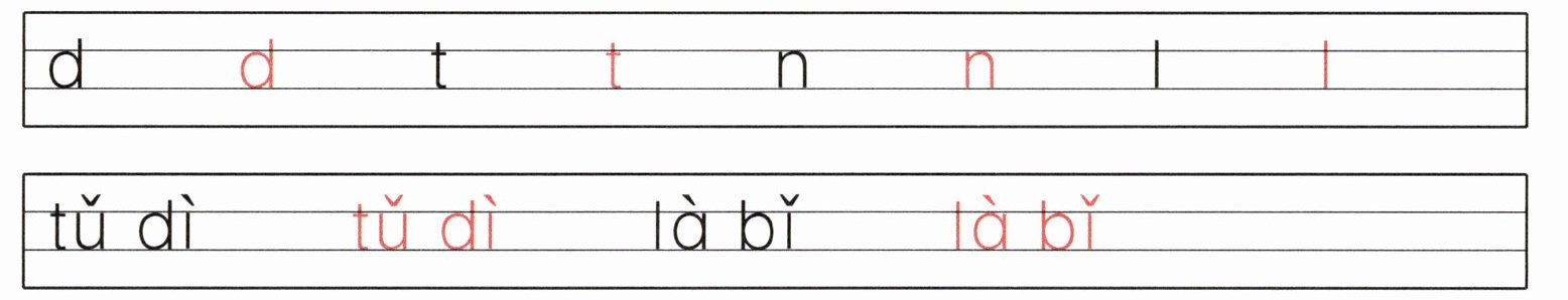 t:先写竖右弯,再写横,占上格和中格,描“t t”;