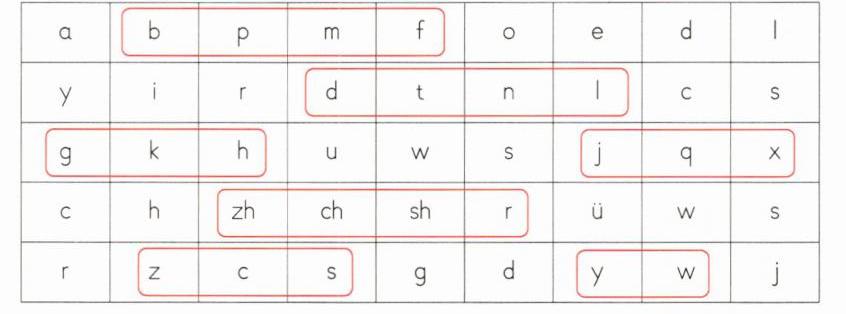 1. 请你照样子,按声母表顺序依次圈出所有声母。