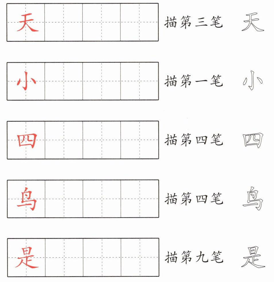 【解析】:题目要求描出指定笔画,需先明确对应汉字。《四季》中核心汉字为“春、夏、秋、冬、叶”等。假设题目依次针对“春”(第三笔:横)、“夏”(第一笔:横)、“秋”(第四笔:点)、“冬”(第四笔:捺)、“叶”(第九笔:无,推测为“雪”第九笔:横折折折钩/横撇弯钩)。按一年级上册要求,规范描出各指定笔画。