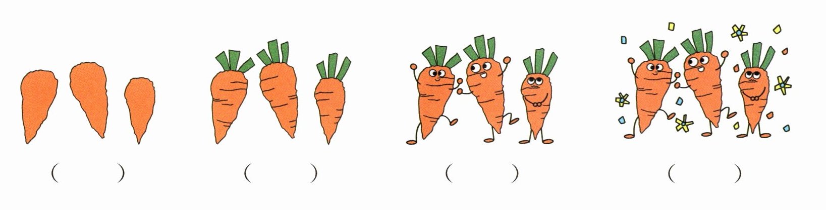 亮亮买了一款胡萝卜拼贴画,可是说明书顺序弄乱了。你能把拼贴步骤和说明书对应起来吗?