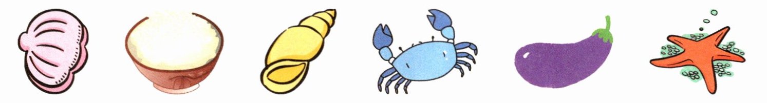 贝壳(bèi ké)(√) 海螺(hǎi luó)(√) 螃蟹(páng xiè)(√) 海星(hǎi xīng)(√)