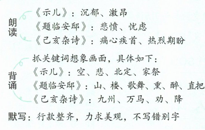 《示儿》:想象诗人临终不见国家统一的遗憾画面,围绕“空、悲、北定、家祭”背诵。
