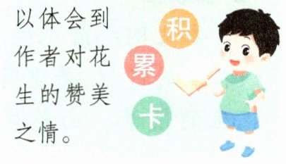 1. 我们家的后园有半亩(mǔ)空地。母亲说:“让它荒着怪可惜的,你们那么爱吃花生,就开辟(pì)出来种花生吧。”我们姐弟几个都很高兴,买种,翻地,播种,浇水,没过几个月,居然收获了。[品词:“居然”强调了“我们”看到花生收获时的惊喜与兴奋之情。][朗读指导:朗读时,语调轻快,读出“我们”种花生、收获花生的喜悦。]