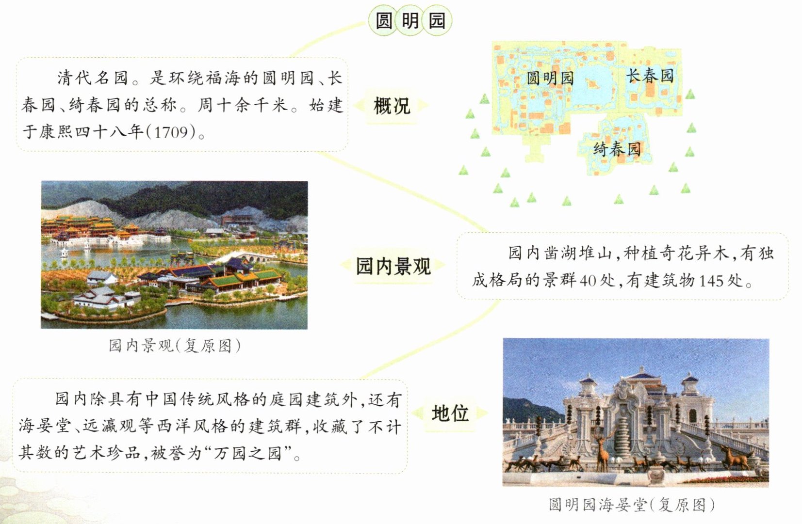 2. 圆明园在北京西北郊,是一座举世闻名的皇家园林。[句解:这句话介绍了圆明园的位置。“举世闻名”写出了圆明园的历史地位之高,“皇家园林”写出了圆明园的规格之高。]它由圆明园、绮春园和长春园组成,所以也叫圆明三园。此外,还有许多小园,分布在圆明园东、西、南三面,众星拱月般环绕在圆明园周围。[比喻:这几句描述了圆明园的总体布局。“众星拱月”运用了比喻的修辞手法,突出了圆明三园的主体地位,“月”指圆明三园,“星”指许多小园。]