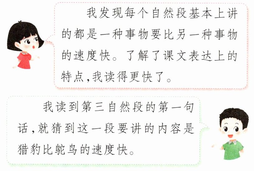 - 菲菲:课文从人奔跑的速度开始写,题目却是“什么比猎豹的速度更快”,我认为是为了吸引读者去阅读,如果题目是“什么比人的速度更快”,大家就没有阅读兴趣了。如果课文的内容从猎豹讲起,不与人的奔跑速度比较,我们就很难感受到猎豹的速度有多快了。