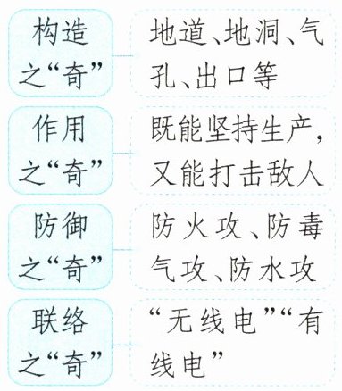 3. 说起地道战,简直是个奇迹。[品词:用“奇迹”一词来形容地道战,可见地道的构造巧妙,作用非凡。]在广阔平原的地底下,挖了不计其数的地道,横的,竖的,直的,弯的,家家相连,村村相通。[句解:“不计其数”说明了地道的数量非常多;“横、竖、直、弯”说明了地道的式样多;“家家、村村”说明了地道分布的范围广。]敌人来了,我们就钻到地道里去,让他们扑个空;敌人走了,我们就从地道里出来,照常种地过日子,有时候还要打击敌人。靠着地道这种坚强的堡垒(lěi),冀中平原上的人民坚持了敌后游击战争。[句解:这句话突出了地道战在打击敌人方面起到的重要作用——人民武装的“坚强的堡垒”。]