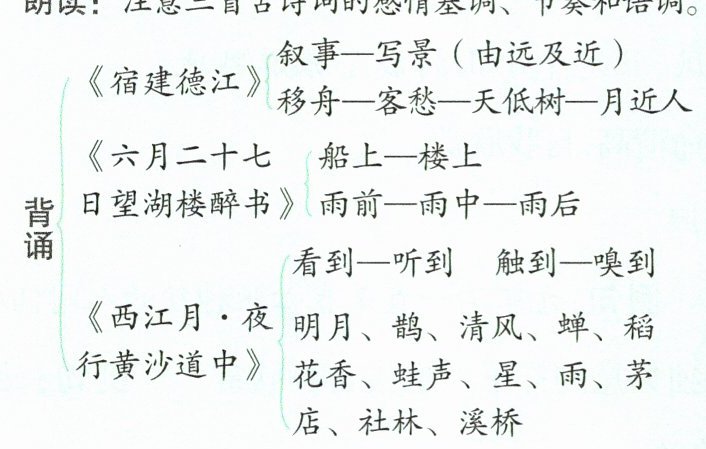 - 提示:$\n$朗读:注意三首古诗词的感情基调、节奏和语调。$\n$背诵:$\n《$宿建德江》:叙事—写景(由远及近);移舟—客愁—天低树—月近人$\n《$六月二十七日望湖楼醉书》:船上—楼上;雨前—雨中—雨后$\n《$西江月·夜行黄沙道中》:看到—听到、触到—嗅到;明月、鹊、清风、蝉、稻花香、蛙声、星、雨、茅店、社林、溪桥