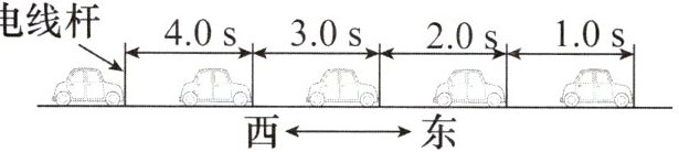 13. 路边每相隔20 m有一根电线杆,一辆小汽车在平直的公路上沿直线向东行驶,它通过相邻两根电线杆之间的路程所需要的时间如图所示,请回答下列问题。