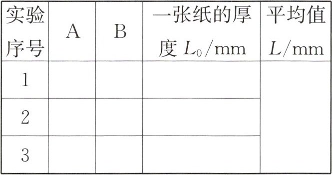 |实验序号|A|B|一张纸的厚度$ L_0/mm $|平均值$ L/mm $|