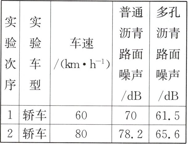 |实验次序|实验车型|车速$/(km·h⁻^1)$|普通沥青路面噪声/dB|多孔沥青路面噪声/dB|