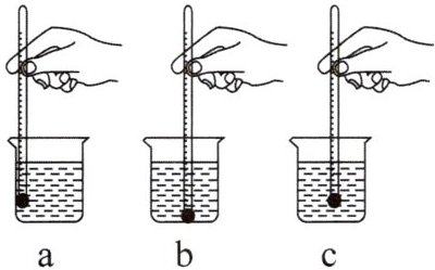 5. 如图所示,用温度计测量温水的温度,a、b、c三次测得的数据分别是$27.5℃$、$27.7℃和28.2℃$,则此温水较准确的温度是(
