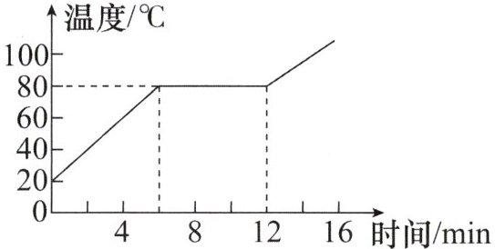 B 【解析】由图知,该物质有固定的熔化温度,所以该物质是晶体,其熔点为80°C,故 A 正确;该物质熔化过程持续的时间为12 min-6 min=6 min,故 B错误;在第12 min时,该物质已经熔化完成,则在第14 min时,该物质处于液态,故 C 正确;在第6 min和第12 min之间,该物质处于熔化过程,处于固液共存状态,吸收热量,温度不变,故 D 正确。