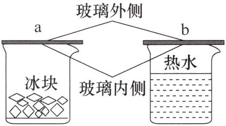 D 【解析】盛有冰块的烧杯,杯外的水蒸气遇冷液化成小水珠附着在玻璃a的外侧;盛有热水的烧杯,杯内温度高,杯内的水蒸气遇冷液化成小水珠附着在玻璃b的内侧。