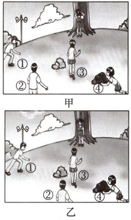 7. 如图是几个孩子在草地上做游戏的场景,游戏开始时,几个孩子在草地上的位置如图甲所示,当站在大树旁的小女孩转过身来时,每个人的位置如图乙所示。请你判断,该过程中运动了的小孩有