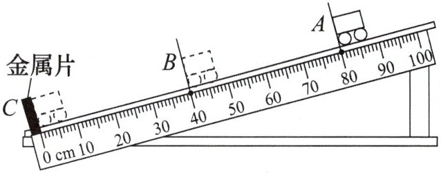 ①若 AB 段的平均速度为 $ v_{AB} $,BC 段的平均速度为 $ v_{BC} $,全程的平均速度为 $ v_{AC} $,则它们的大小关系为