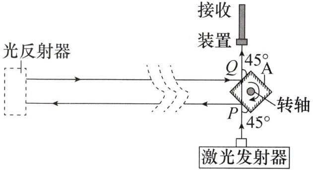 11. 光速的测定在物理学中有多种方法,迈克尔逊曾用类似于下述方法在地球上较精确地测定了光速。将激光发射器和接收装置按图示位置固定,装置A是四个侧面均镀有高反光涂层的正方体,可绕固定的中心轴转动(图示为俯视图),当正方体转动到图示位置静止时,激光束恰能以45°角照射到某侧面的中心P点处,并被反射到相距几十公里外的一个山顶上,又经此处的光反射器(内部结构未画出,不计光在其中的传播时间)反射后,平行于原光线射到正方体另一侧面中心的Q点处,最终被接收装置接收到。