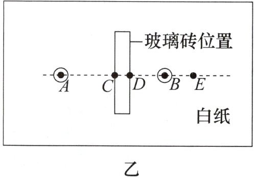 (均选填“AC”“AD”“BD”或“BC”)。图乙中 E 为较暗的像点,经测量 $ AC $ 的长度为 5.00 cm,$ DE $ 的长度为 5.50 cm,则玻璃砖的厚度为0.50