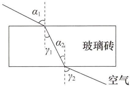 9. 一束光从空气中斜射向玻璃砖并穿过,其光路如图所示。关于$α_1、$$α_2、$$γ_1、$$γ_2$四个角的大小关系正确的是(