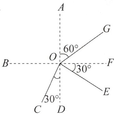 B [解析]入射光线与法线的夹角为入射角,反射光线与法线的夹角为反射角,根据光的反射定律可知反射角等于入射角。由图可知∠AOG=60°,则∠GOF=90°−60°=30°,已知∠EOF=30°,可知∠GOF=∠EOF=30°,所以在AD的右侧发生了光的反射,则AD 为玻璃和空气的界面,BF为法线,因为折射光线和入射光线分别位于法线两侧,所以GO为入射光线,OE为反射光线,OC为折射光线,入射角∠GOF 为30°。