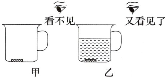 3. 陶瓷茶杯底部放有一枚硬币,人移动到某一位置时看不见硬币(如图甲),人不动,往茶杯中倒入一些水后,又能够看见硬币了(如图乙)。