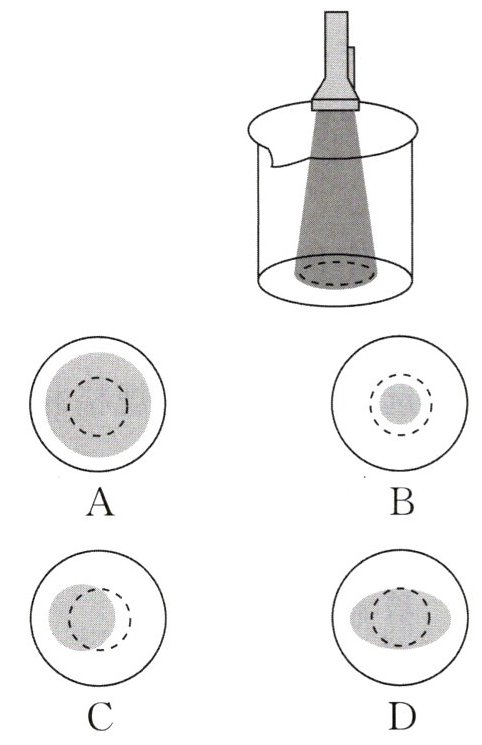 5. 手电筒发出的光垂直地照射到一个空的烧杯的底部。光线投射到烧杯底部的光圈如图中虚线所示,把水倒入烧杯中,当烧杯注满水时,下列能正确表示烧杯底部光圈的是( )