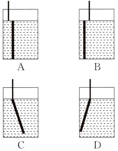上述光线相当于在B处由水中射入空气中,图中的∠i和∠r分别为此光线的入射角和折射角,根据光的折射规律可知,应有∠r>∠i;所以观察者在P处看到的木棍A的像A'的位置不是A的实际位置,即像A'的位置偏左;据此可知,木棍竖直插入烧杯中时,从侧面观察,看到的应该是B。