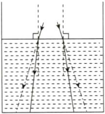 B [解析]当光从空气斜射入水中时,折射角小于入射角,如图为最左边和最右边的光线发生折射时的光路(虚线表示没有折射时的光路)。