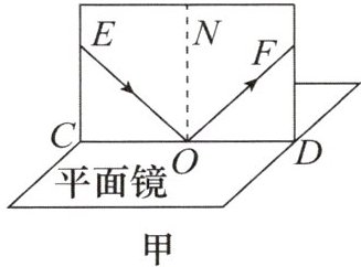 14. 小林在“探究光的反射定律”实验中,如图甲所示,把一个平面镜放在水平桌面上,再把一张纸板竖直地立在平面镜上,使一束光紧贴着纸板沿某一角度射到点O,经平面镜反射,沿另一个方向射出。在纸板上用笔描出入射光EO和反射光OF的径迹。