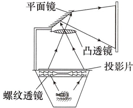 3. 如图是一个投影仪,它由凸透镜、平面镜、光屏等组成。其中投影片通过凸透镜后成