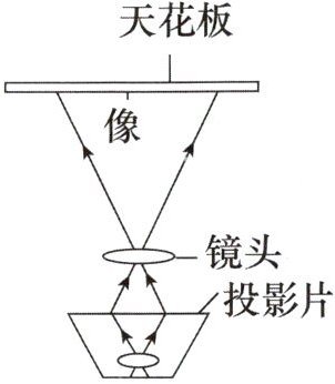 4. 把投影仪上的平面镜(反光镜)取下,将投影片放到载物台上。调节镜头,在天花板上就能得到投影片上的图案清晰的像。关于投影仪,下列说法不正确的是(