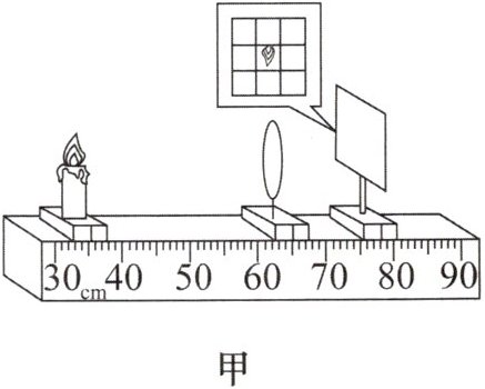 10. 在探究凸透镜成像的规律时,小明用蜡烛、焦距为10 cm的凸透镜和光屏在光具座上做实验。他调节好器材的位置,发现烛焰恰好在光屏上成缩小的实像。如图甲所示。