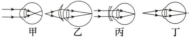 C 【解析】图甲的入射光线会聚在视网膜的前方,所以图甲表示的是近视眼的成像情况;近视眼是因为晶状体焦距太短,像落在视网膜的前方,为了使光线会聚在视网膜上,需要在光线进入人的眼睛以前发散一下,因此戴对光线具有发散作用的凹透镜来矫正,因此图丙能正确表示近视眼的矫正情况,故 A 错误,C 正确。凸透镜对光有会聚作用,图乙中若去掉凸透镜,像会成在视网膜后,故 B 错误。图丁的入射光线会聚在视网膜的后方,所以图丁表示的是远视眼的成像情况;为了使光线会聚在视网膜上,需要在光线进入人的眼睛以前会聚一下,因此佩戴对光线具有会聚作用的凸透镜来矫正,故 D 错误。