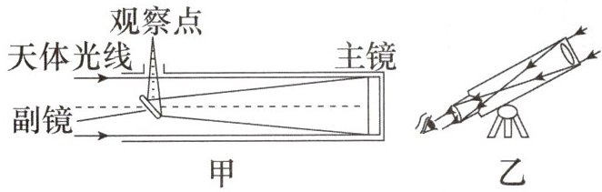 7. 深圳市天文台位于大鹏新区南澳街道西涌,配备反射式望远镜、光学望远镜等多种观测设备。反射式望远镜的原理如图甲所示,利用一个球面反射镜将进入镜头的光线会聚后反射到位于镜筒前端的一个平面镜上,然后再由这个平面镜将光线反射到镜筒外的目镜里,这样我们便可以观测到星空的影像,而光学望远镜的原理如图乙所示。下列说法正确的是(
