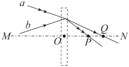 1. 如图所示,虚线框内为一透镜,MN为透镜的主光轴,O是透镜光心,a(双箭头)和b(单箭头)是射向透镜的两条光线,已知光线a通过透镜之后与MN交于点P,光线b通过透镜之后与MN交于点Q。由图可知,下列说法正确的是(