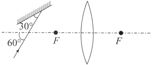13. 如图所示,一条光线与凸透镜主光轴的夹角为60°,斜向上射到放在主光轴上方的平面镜上,入射光线与镜面夹角为30°。请完成光路图,并标出反射角的大小。