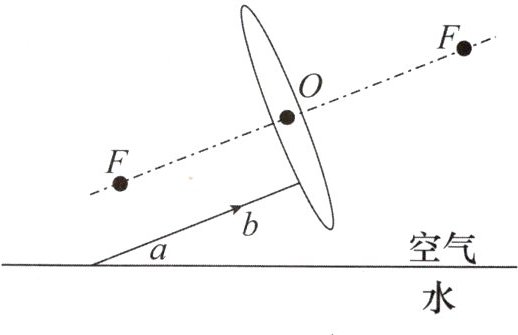 14. 如图所示,由水中折射出的一条光线ab照射到凸透镜上,光线ab与凸透镜的主光轴平行。已知F为凸透镜的焦点,O为光心。请画出: