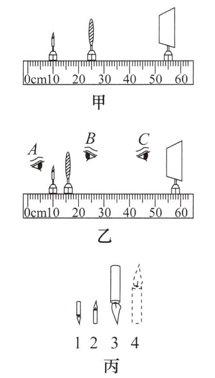 (2)物距小于1倍焦距时,凸透镜成正立、放大的虚像,此时光屏承接不到像,透过凸透镜观察蜡烛看到正立、放大的虚像,故图丙中的4符合像的性质;虚像与成像物体同侧,所以应从B处观察。