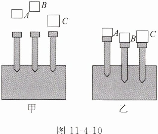 10. 在探究“重力势能的大小与哪些因素有关”的实验中,已知物块A、B、C的质量关系为m_A = m_B < m_C,三个完全相同的木桩和三个物块从高处释放时的位置如图11-4-10甲所示;木桩被打击后陷入沙中的情形如图11-4-10乙所示,物块B、C将木桩打入沙中的深度相同。