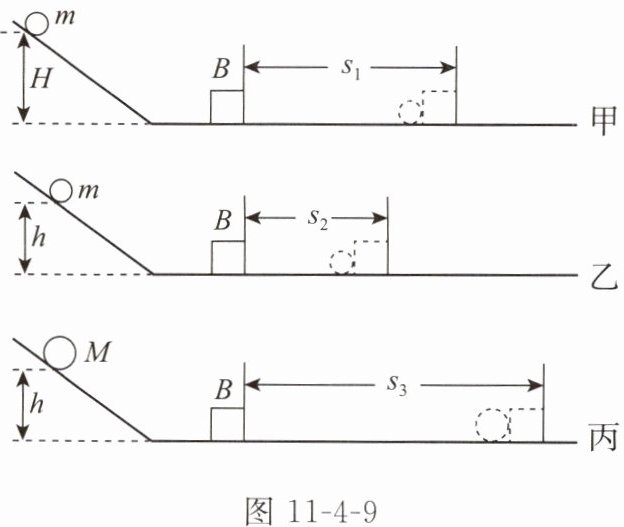 9. 在“探究动能的大小与哪些因素有关”的实验中,小明将质量不同(M>m)的两个钢球分别从斜面上不同的高度(H>h)由静止自由滚下,观察木块B被撞击后移动的距离,实验过程如图11-4-9所示。