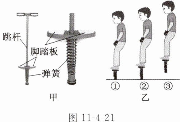 9. 蹦蹦杆是一种健身器材,其脚踏板连有一根弹簧(图11-4-21甲)。一名同学玩蹦蹦杆的过程如图11-4-21乙所示:①挤压弹簧到最低位置;②弹簧恢复原状,人获得一个向上的速度;③人向上运动到达最高位置。下列说法正确的是(