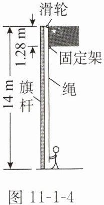 2. 周一清晨,学校举行升国旗仪式,升旗手小明将五星红旗竖直匀速升到旗杆顶端,如图$11 - 1 - 4$所示。旗杆的高度为$14m$,国旗的尺寸为$1.92m × 1.28m$,质量(含金属固定架)为$1kg$,开始升旗时国旗底端(固定架底端)到地面的距离为$0.72m$,已知在旗杆顶部有一个定滑轮,$g取10N/kg$,不计绳重和摩擦,求整个升旗过程中小明拉力对国旗做的功。