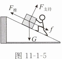 3. 如图$11 - 1 - 5$所示,小桂沿着斜面推动木箱向上移动的过程中,下列木箱受到的力中,没有对木箱做功的是(