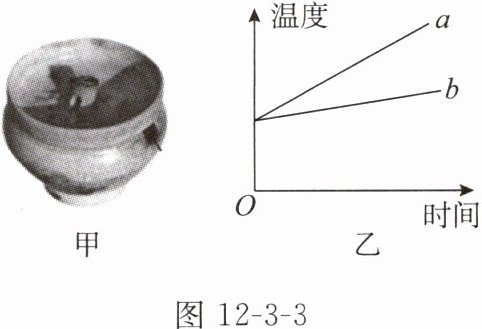 (选填“陶瓷”或“铜”)升高的温度比较小,使盏和油的温度不会太高,从而减慢了油的蒸发。图 $12 - 3 - 3$ 乙中 $a$ 图线表示铜