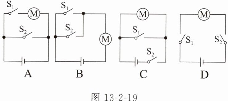 4. 某酒店的电梯要刷卡才能到达房间的楼层。当入住客人刷卡时开关$S_1$闭合,再按下电梯上相应楼层的按钮(相当于闭合开关$S_2),$电动机才启动。在图13-2-19所示的电路中,符合设计要求的是(