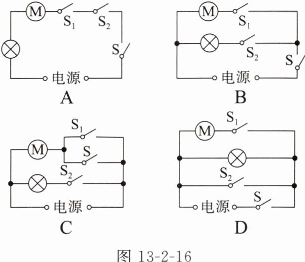 3. 某智能家居系统设计要求:当呼唤系统时,整个系统做好工作准备(相当于闭合开关S);当发出语音“拉开窗帘”时(相当于闭合开关$S_1),$电动机工作拉开窗帘;当发出语音“打开台灯”时(相当于闭合开关$S_2),$台灯工作。在图13-2-16所示的电路中,符合设计要求的是(