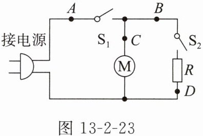 9. 图13-2-23是某取暖器的简化工作电路图,图中元件M是装有扇叶的电动机,元件R是发热体,通电时会产生热量,若只闭合开关$S_1,$则送出的是