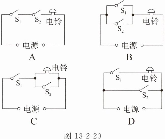5. 在公交车后门两侧扶杆上均装有一个红色按钮,每一个按钮相当于一个开关,当乘客按下任意一个按钮,驾驶台上的电铃就会发声,提醒司机有人下车。在图13-2-20所示的四种设计电路中,符合要求的是(