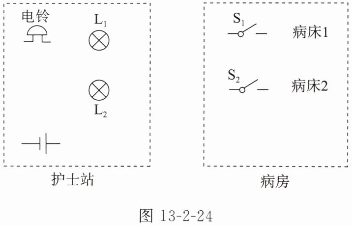 10. 为了使医务人员能随时看护患者,小明想设计一种呼唤电路,要求:病床1旁的开关$S_1$控制指示灯$L_1$和电铃,病床2旁的开关$S_2$控制指示灯$L_2$和电铃,患者只要按床旁的开关,医务人员就知道谁在呼唤。请在图13-2-24中连线,形成符合要求的完整电路图。